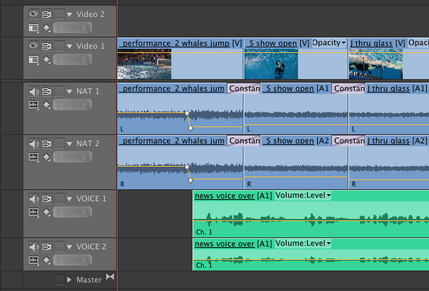 Here’s an example of a Timeline in Adobe Premiere Pro. Notice that there are two VO tracks and two Nat sound tracks. The PKG starts with the nat sound peaking at -15 dB, then I used keyframes to drop the volume just before the VO begins. For the rest of this segment, the VO peaks consistently between -12 dB and -18 dB, while the nat sound remains present but never overpowers the VO.